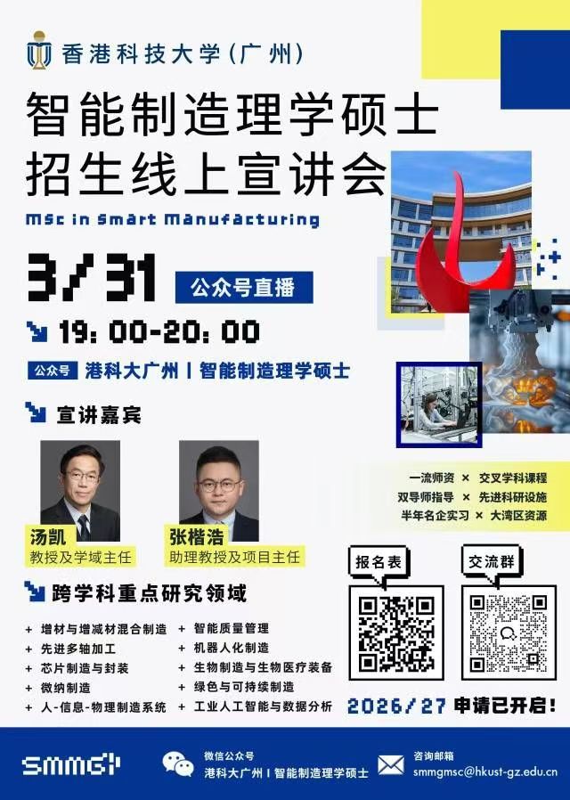 香港科技大学广州|智能制造理学硕士学位项目26Fall招生宣讲会—线上专场!!